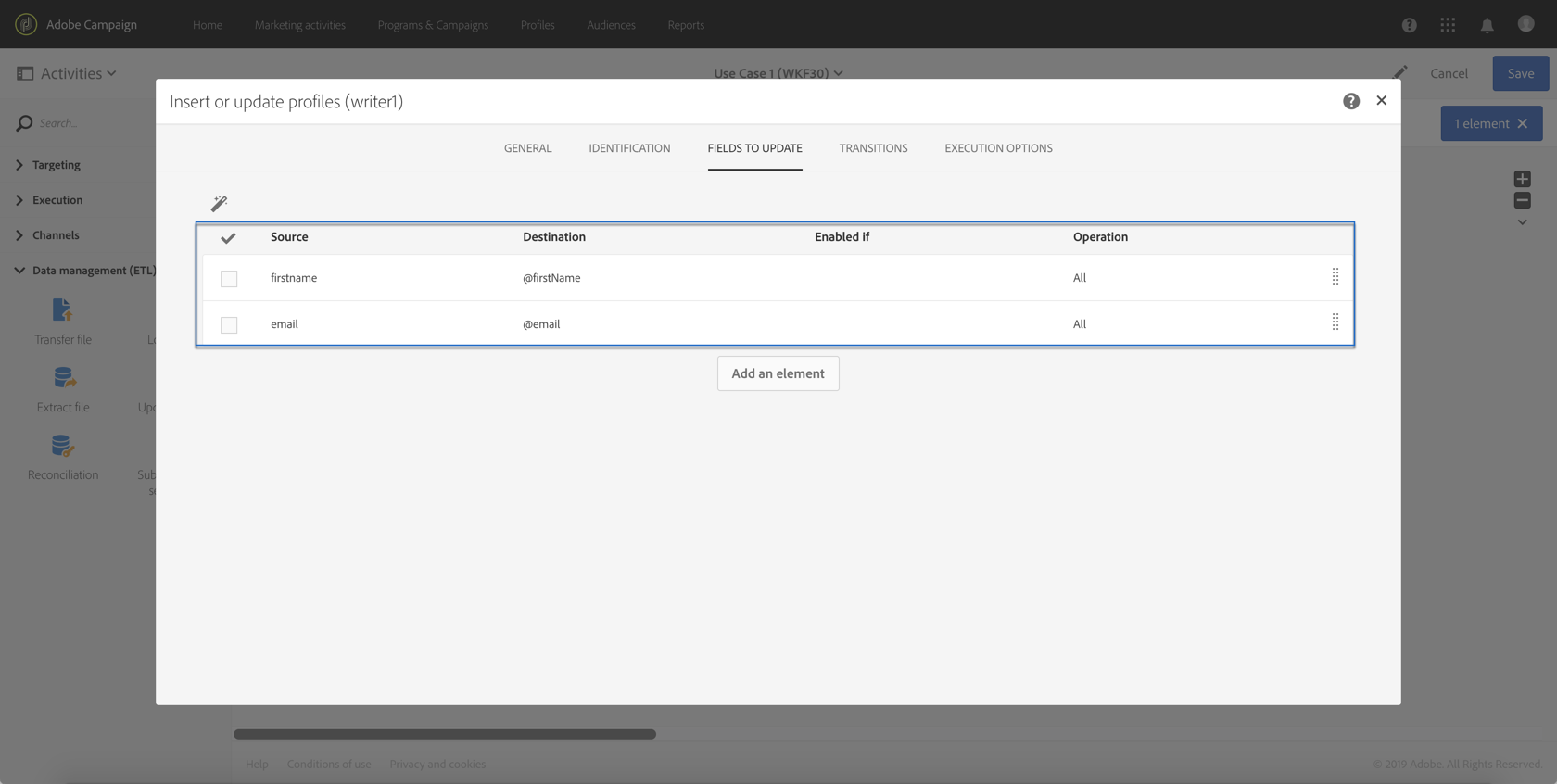 Fields to update 탭을 선택한 다음 데이터베이스에서 업데이트할 필드(이 경우 firstname 및 email 필드)를 지정하십시오.