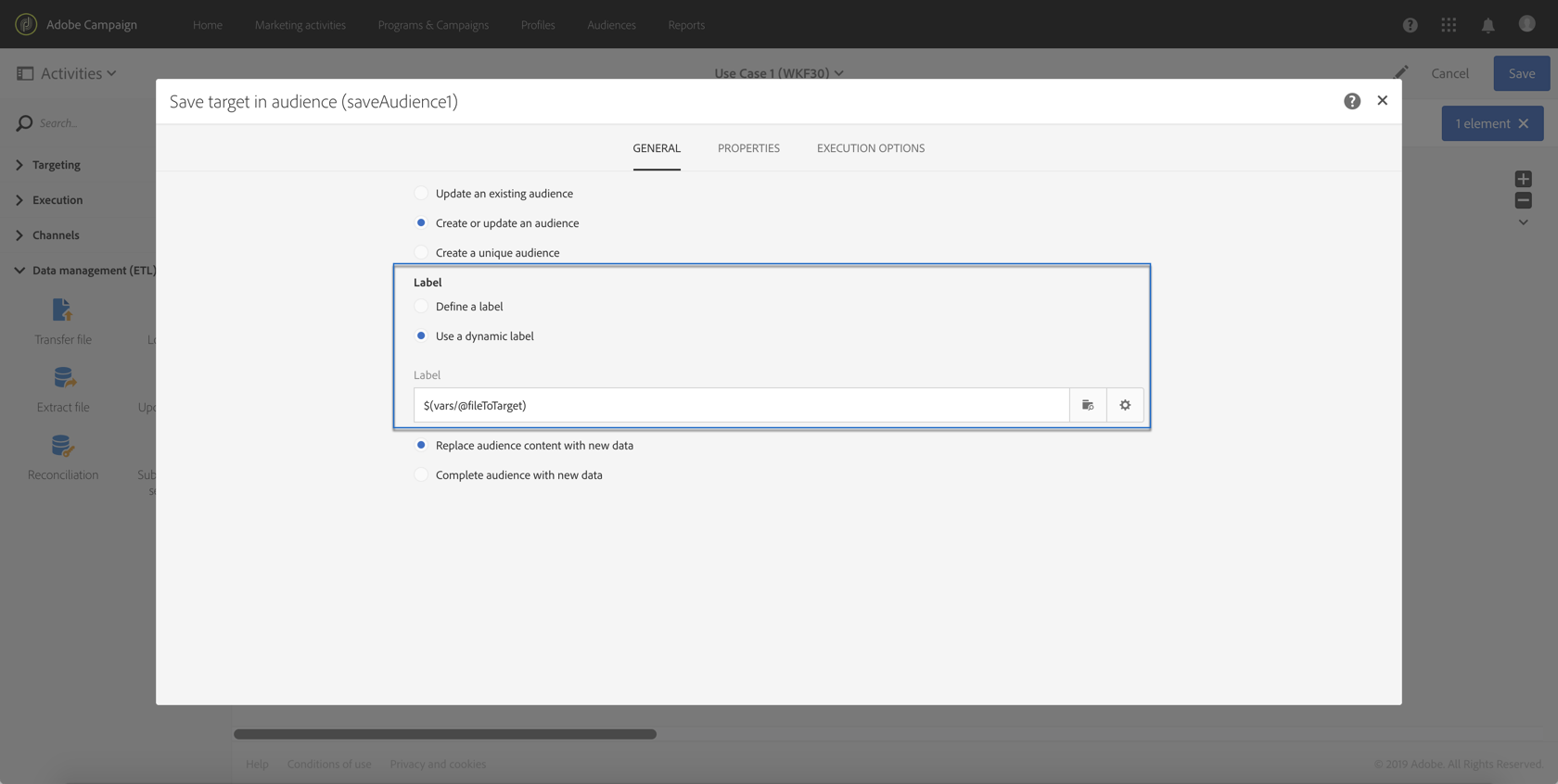 Use a dynamic audience 옵션을 선택한 다음 fileToTarget 매개 변수를 읽을 대상 이름으로 사용합니다.