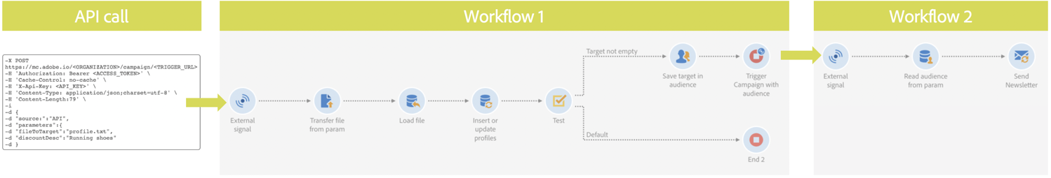매개 변수를 사용하여 워크플로우 1을 트리거하기 위해 API 호출을 만듭니다. API 호출 구문에 대한 자세한 내용은 Campaign Standard REST API 설명서를 참조하십시오.