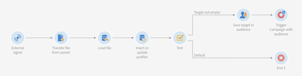 - 워크플로 빌드 1: 워크플로가 파일을 전송하고 데이터베이스에 로드합니다. 그런 다음 데이터가 비어 있는지 테스트하고, 최종적으로 프로필을 대상자에 저장합니다. 마지막으로 워크플로우 2가 트리거됩니다. 2단계: 워크플로 구성을 참조하십시오.
