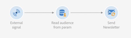 - Read audience 활동: 워크플로우 1에 저장된 대상자를 읽습니다.
