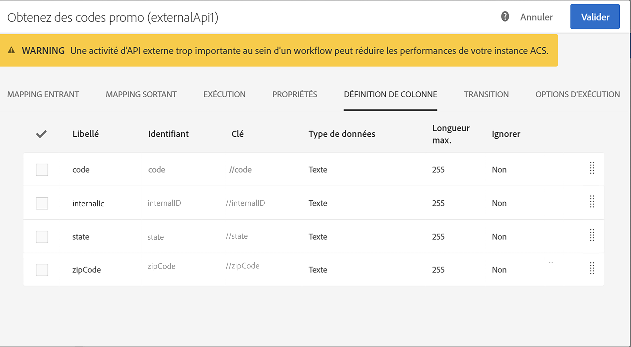 L’activité d’API externe a pour objectif de récupérer les données de l’ensemble de la campagne (dernier ensemble d’offres, derniers scores, etc.), et non de récupérer des informations spécifiques pour chaque profil, car cela peut entraîner le transfert de grandes quantités de données. Si le cas pratique le requiert, la recommandation consiste à utiliser l'activité Transfert de fichier.