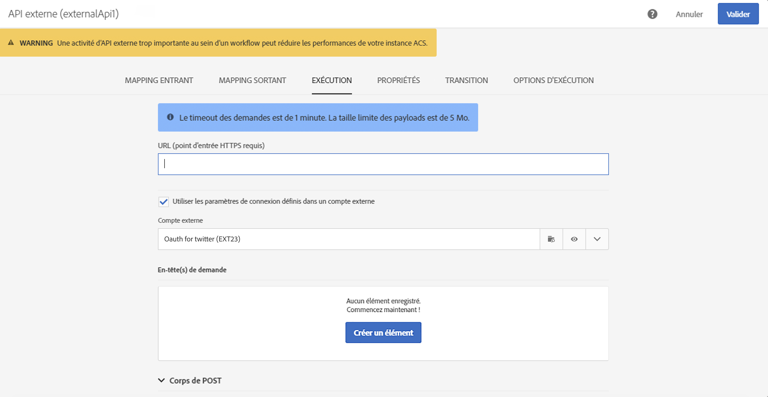 L’activité API externe récupère des données dans le workflow d’un système externe via un appel API HTTP.