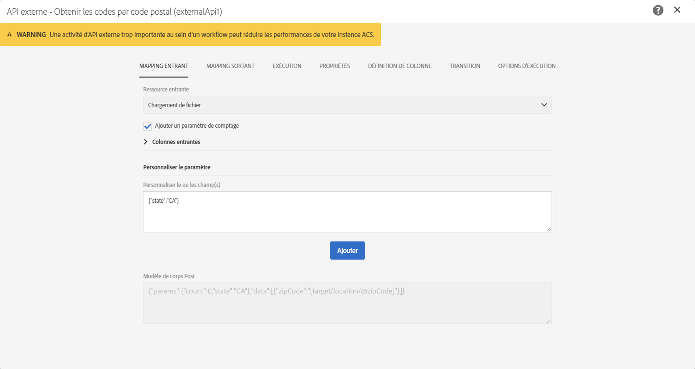 La zone de texte Personnaliser le paramètre permet d’ajouter un code JSON valide avec des données additionnelles requises par l’API externe. Ces données additionnelles seront ajoutées à l’objet params du code JSON généré.