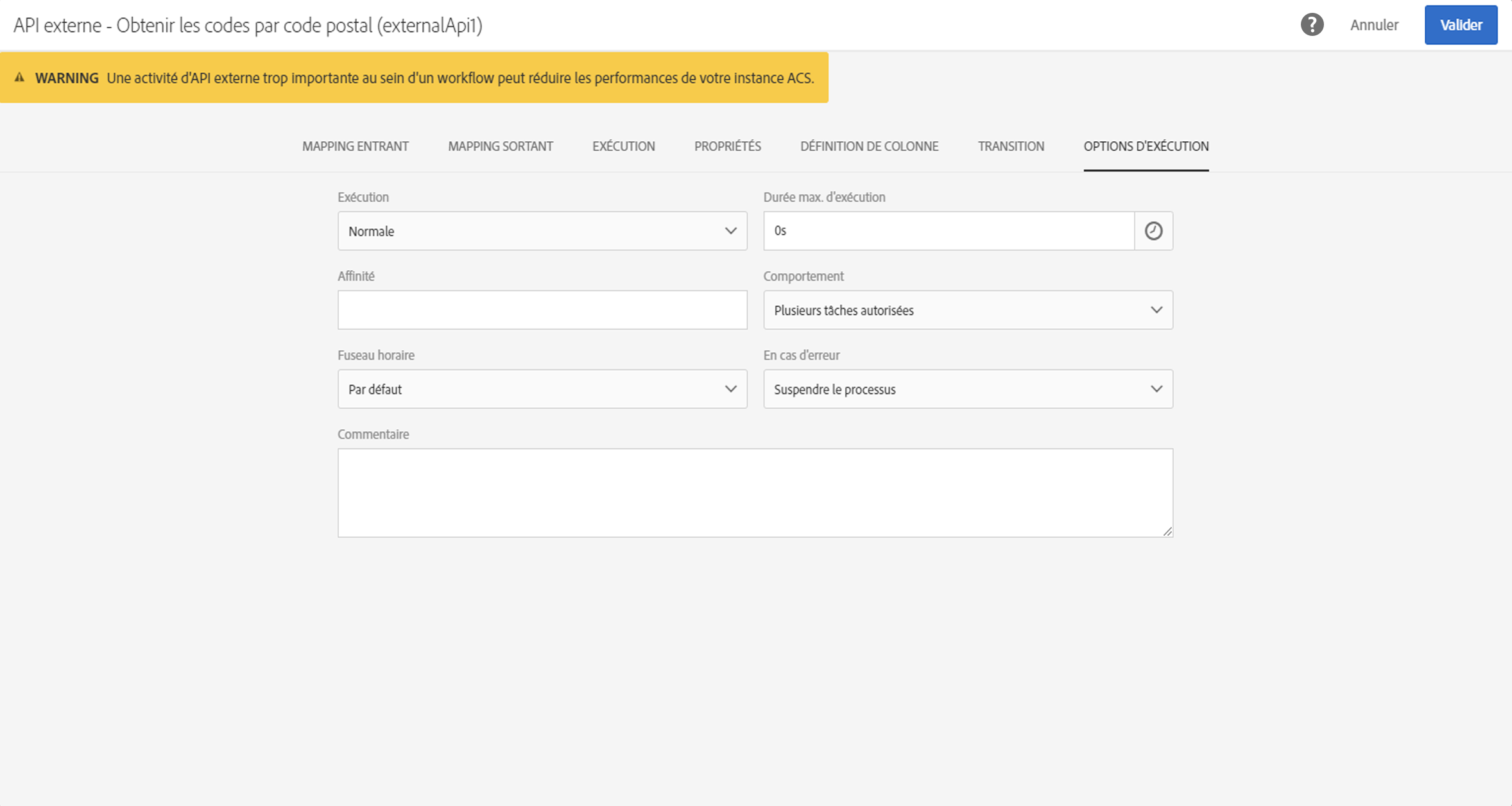 Cet onglet est disponible dans la plupart des activités de workflow. Pour plus d’informations, consultez la section Propriétés d’une activité.