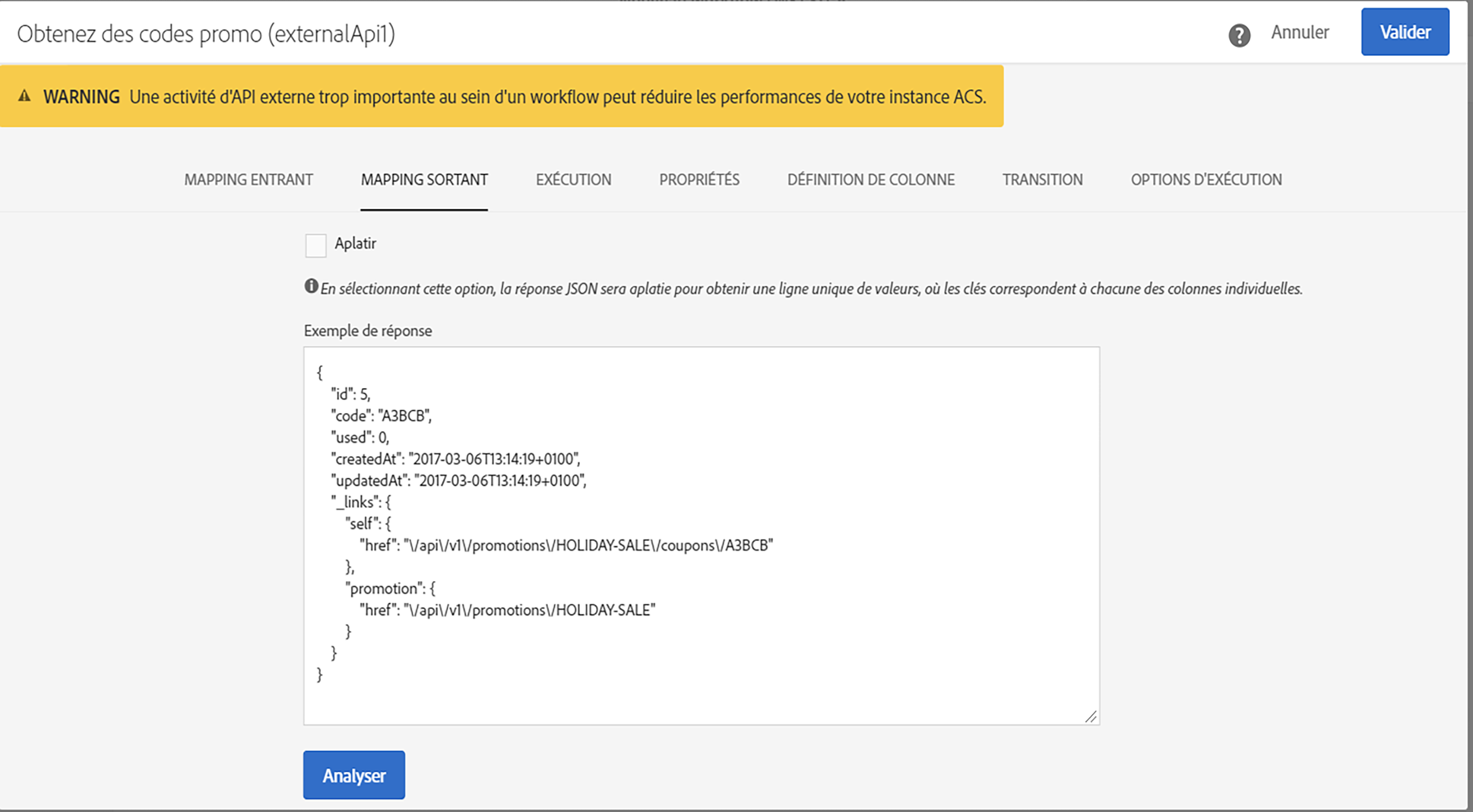 Cet onglet s’affiche lorsque le format des données de réponse est complété et validé dans l’onglet Mapping sortant.