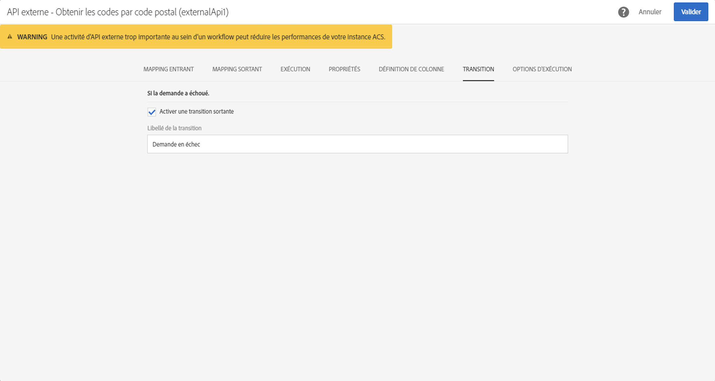 Cet onglet permet d’activer la transition sortante et son libellé. Cette transition spécifique est utile si le délai d’expiration ou la payload dépasse la limite de taille des données.