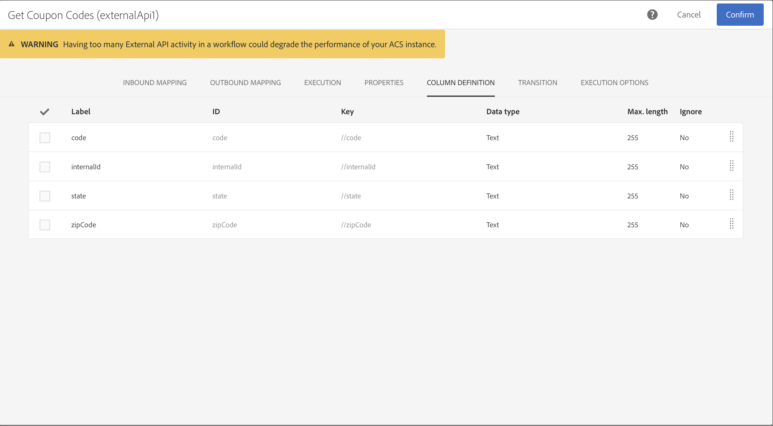 사용자는 인바운드 열 섹션을 통해 인바운드 전환 테이블에서 모든 필드를 추가할 수 있습니다. 선택한 열이 데이터 개체의 키가 됩니다. JSON의 데이터 개체는 인바운드 전환 테이블의 각 행에서 선택한 열에 대한 데이터가 포함된 배열 목록입니다.