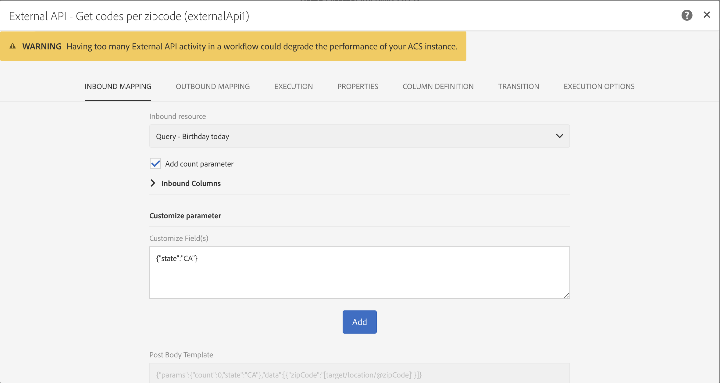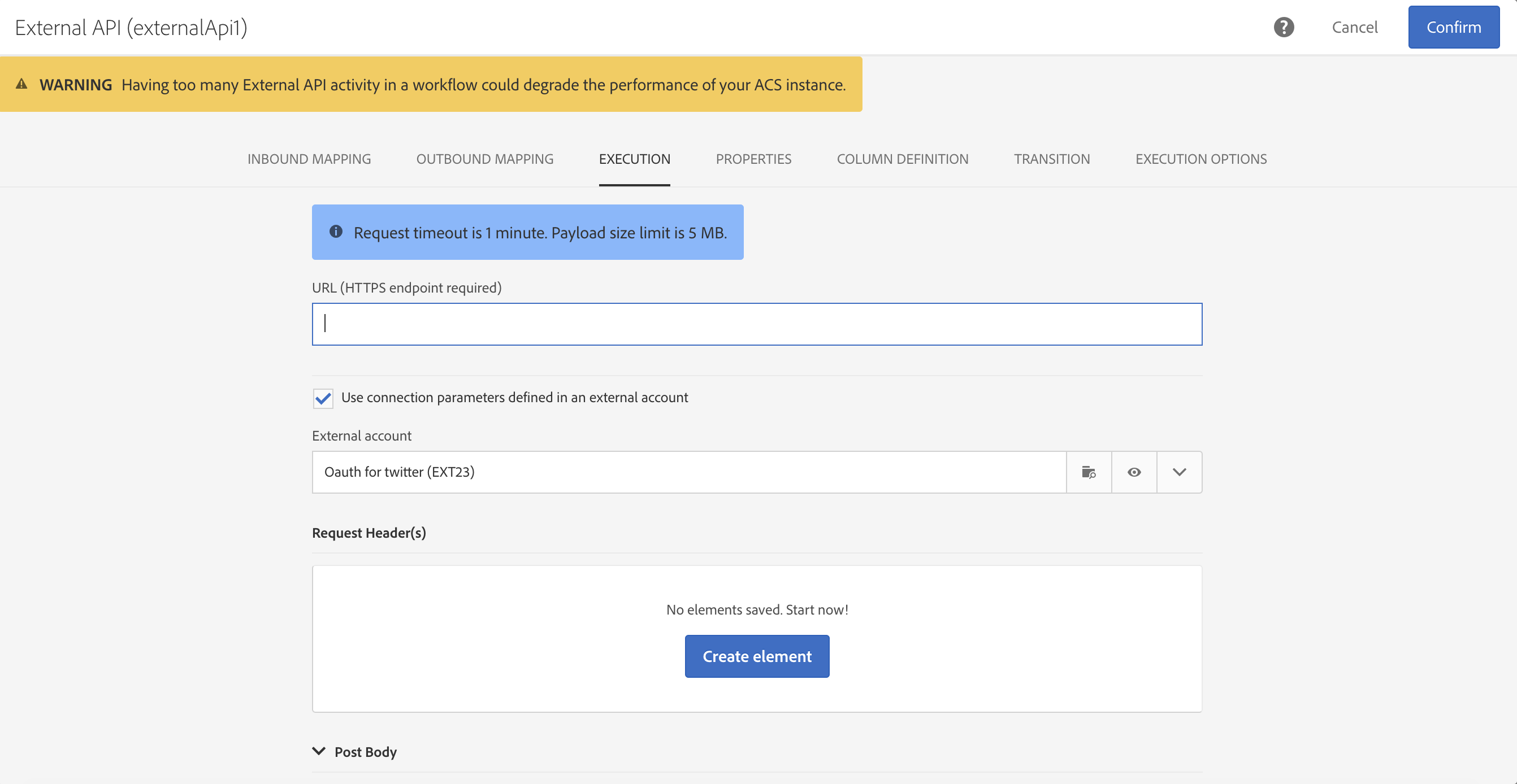 Campaign Standard 20.4 릴리스에서는 모범 사례에 맞게 http 응답 데이터 크기 제한 및 응답 시간 제한이 완화되었습니다. 자세한 내용은 제한 및 보호 기능. 이러한 보안 수정 사항은 기존 외부 API 활동에는 적용되지 않습니다. 따라서 모든 워크플로우에서 기존 외부 API 활동을 새 버전으로 대체하는 것이 좋습니다.