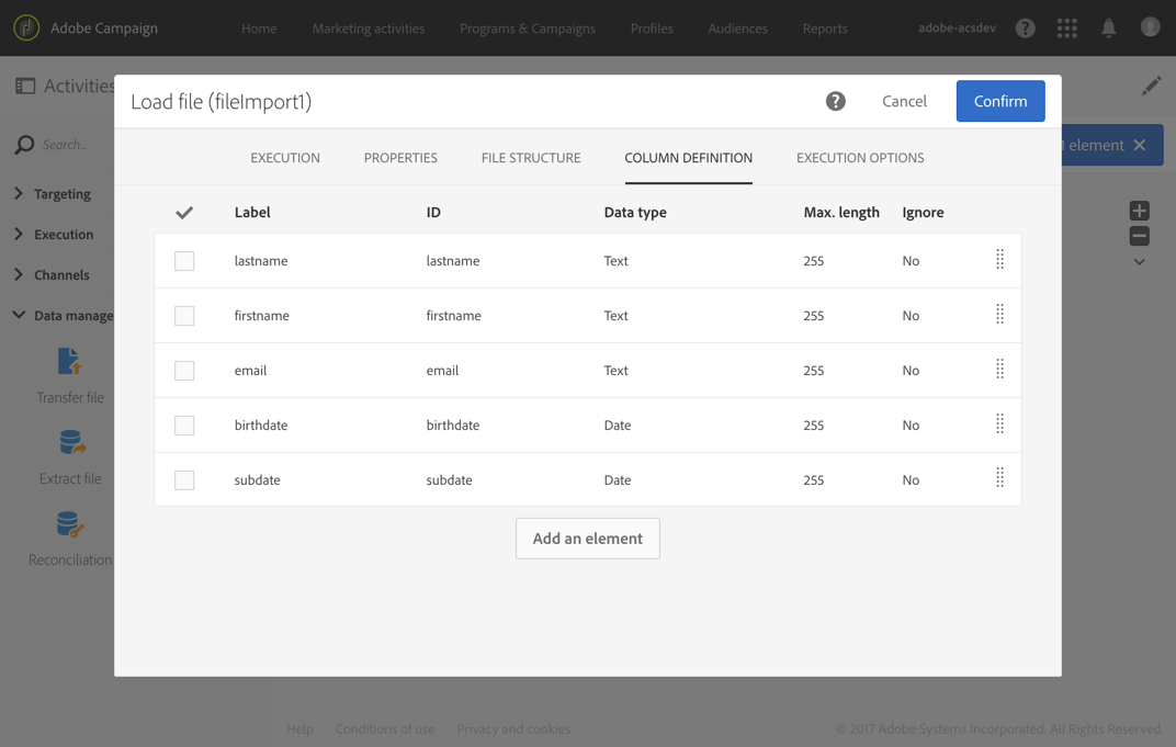 Load file 활동은 프로필 파일을 로드하고 가져온 열의 구조를 정의합니다.