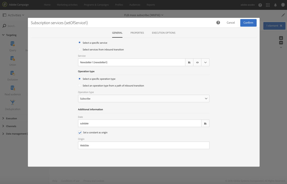 Subscription Services 활동은 하나의 동작으로 여러 프로필을 서비스 구독 또는 구독 취소하도록 하는 유일한 Adobe Campaign 기능입니다.