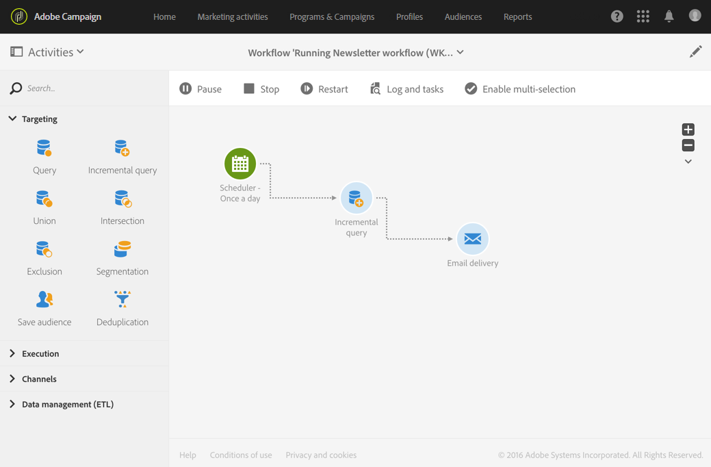 按鈕會停止正在執行的工作流程,而工作流程則會呈現​已完成 (綠色)狀態。 如果可能的話,進行中的作業會中斷,而且會立即取消匯入或進行中的SQL查詢。 您無法從工作流程停止的同一位置繼續。