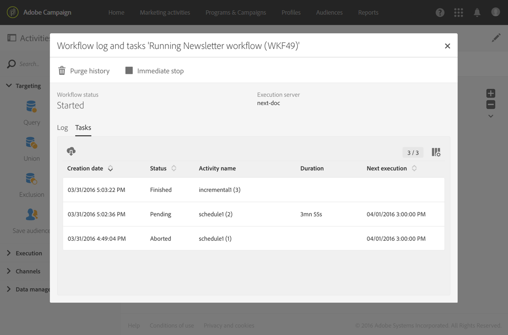 Supervisors: 워크플로우에 오류가 발생하면 알릴 사람 그룹(이메일 및 인앱 알림)을 정의할 수 있습니다. 정의된 그룹이 없으면 아무도 알림을 받지 않습니다. Adobe Campaign 알림에 대한 자세한 내용은 Adobe Campaign 알림.