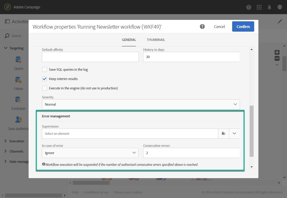 Supervisors:可讓您定義工作流程發生錯誤時要通知的人員群組(電子郵件和應用程式內通知)。 如果未定義群組,則不會通知任何人。 如需 Adobe Campaign 通知的詳細資訊,請參閱 Adobe Campaign 通知。