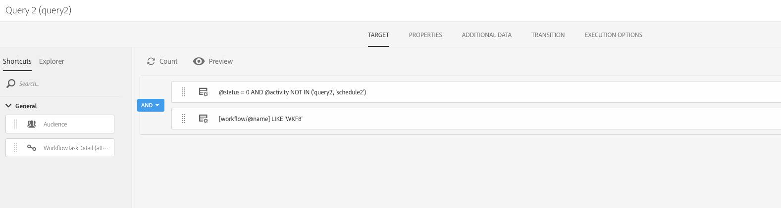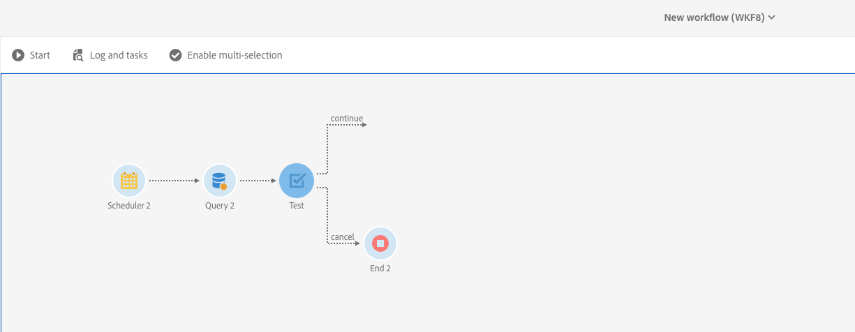 첫 번째 규칙은 현재 작업(query2)과 현재 워크플로우에 속하는 다음 예약 작업(schedule2)을 필터링합니다.