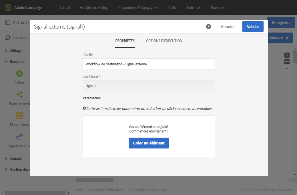 L'activité Signal externe est conçue pour être utilisée comme première activité de workflow. Elle peut être déclenchée à partir de l'activité Fin d'un autre workflow ou d'un appel API REST (voir à ce propos la documentation de l'API).
