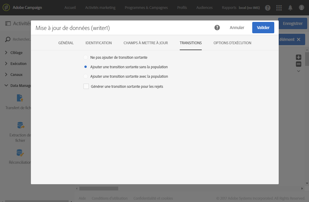 Par exemple, dans une activité Mise à jour de données, allez dans l'onglet Transitions et cochez l'option Ajouter une transition sortante sans la population. Cette option vous permet d'ajouter une transition qui ne contient pas de données et n'occupe pas d'espace inutilement sur votre système. Elle sert uniquement à relier l'activité Fin supplémentaire qui déclenche le workflow de destination.
