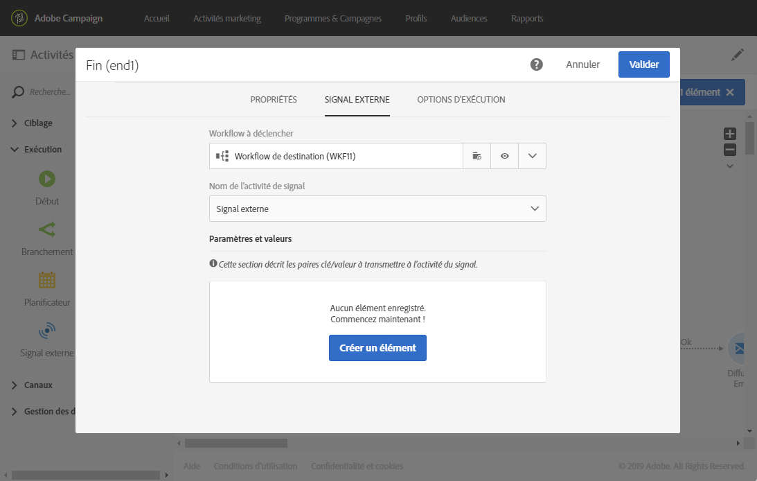 L'activité Signal externe déclenche un workflow lorsque certaines conditions sont remplies dans un autre workflow ou un appel de l'API REST.