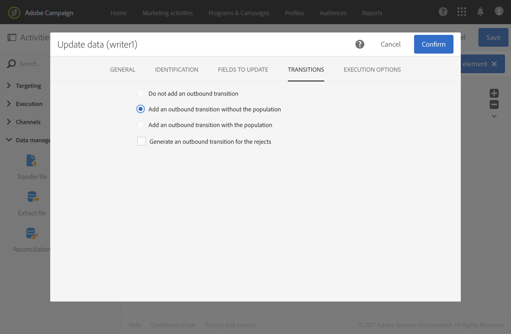 예를 들어 Update data 활동에서 Transitions 탭으로 이동하여 Add an outbound transition without the population 옵션을 선택합니다. 이 옵션을 사용하면 데이터가 포함되지 않고 시스템에서 불필요한 공간을 사용하지 않는 전환을 추가할 수 있습니다. 대상 워크플로우를 트리거하는 추가 End 활동을 연결하는 데 사용됩니다.