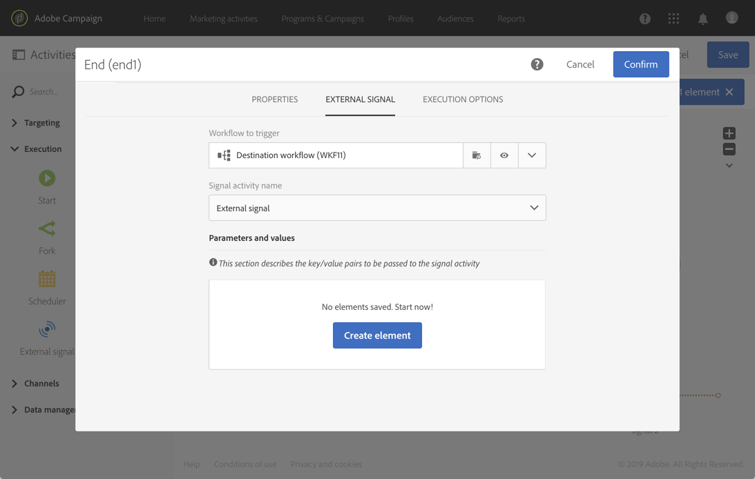 소스 워크플로우 또는 REST API 호출의 End 활동이 실행되면 대상 워크플로우는 External signal 활동에서 자동으로 트리거됩니다.