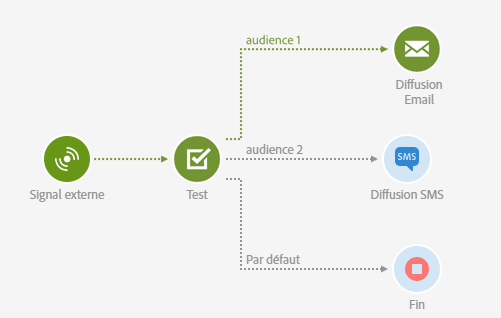 Les conditions peuvent être basées sur des fonctions ou des variables, par exemple des variables d’événements qui ont été déclarées dans l’activité Signal externe du workflow.