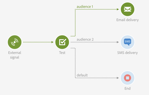 테스트 활동은 연결된 조건을 충족하는 첫 번째 전환을 활성화합니다.