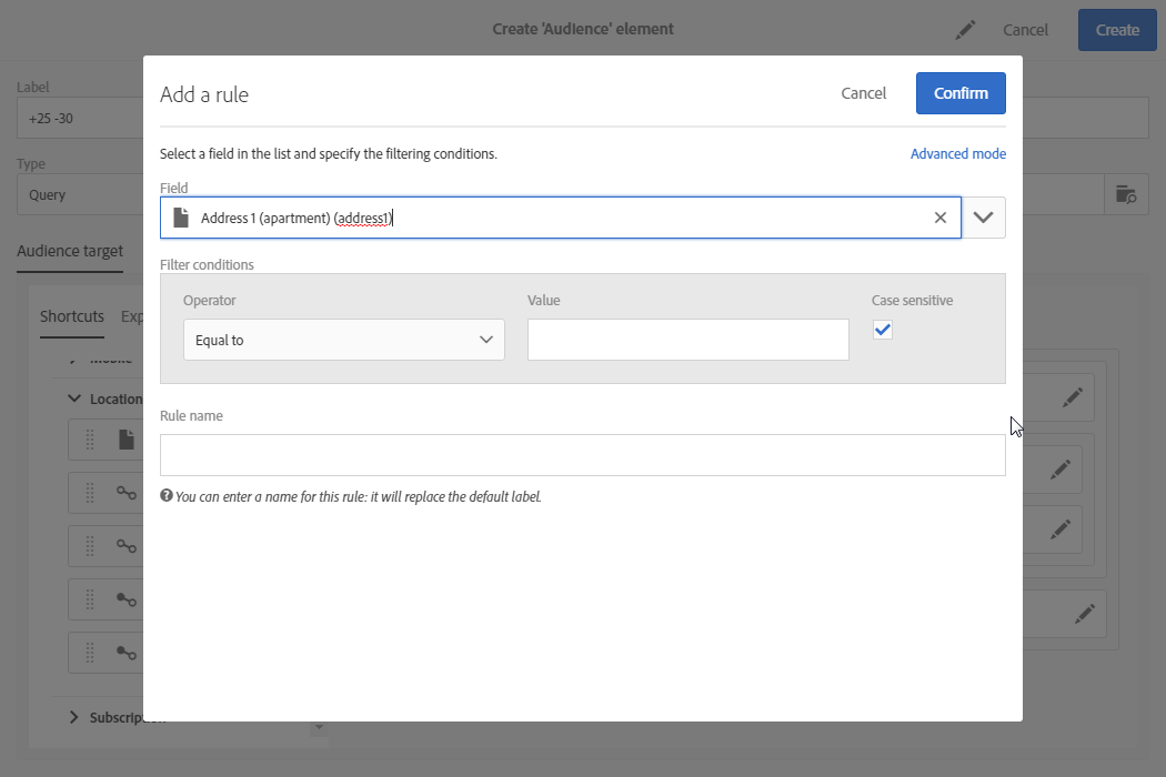 팔레트에서 작업 영역으로 요소를 옮깁니다. 규칙 편집 창이 열립니다.