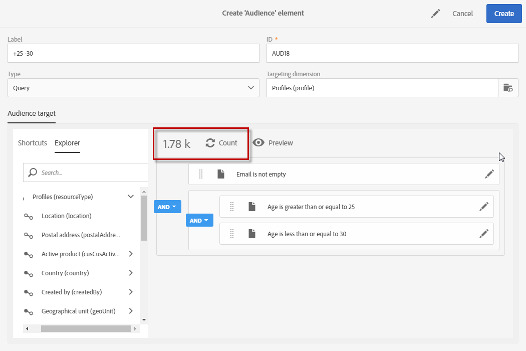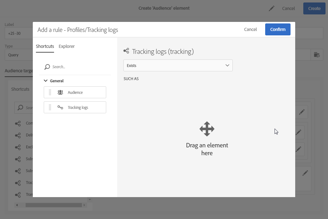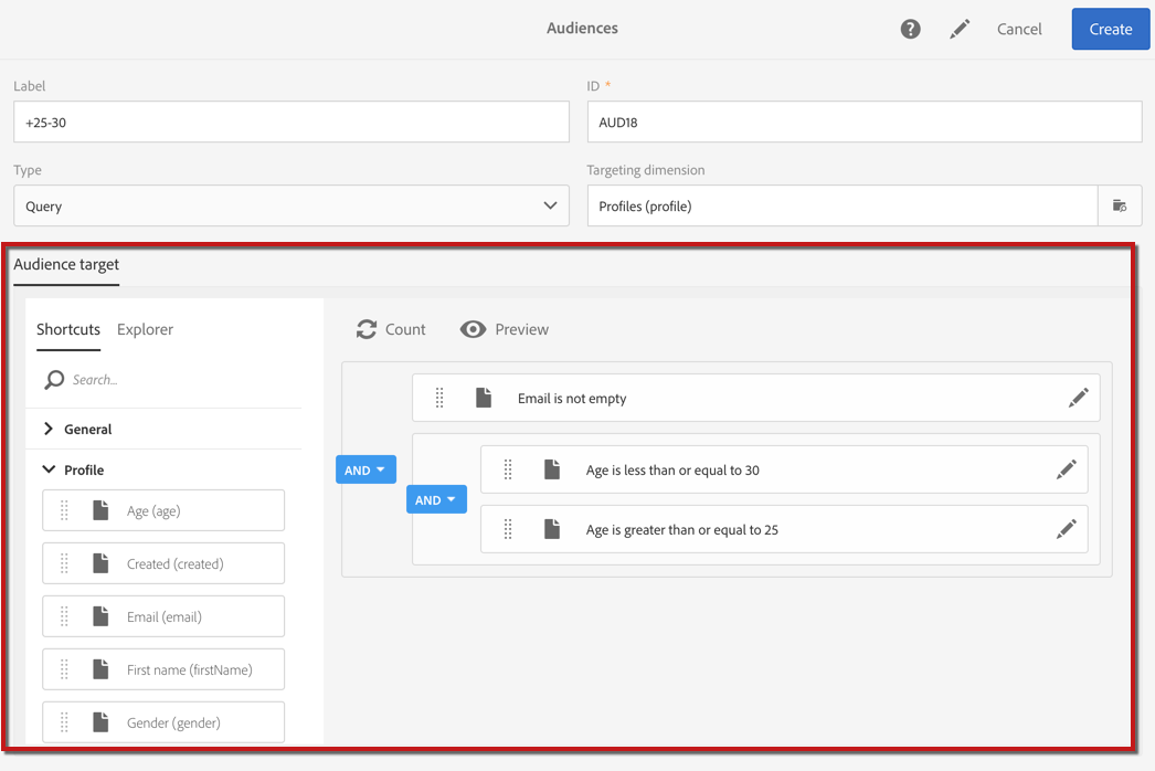 쿼리 편집기를 사용하여 메시지의 대상자나 테스트 프로필, 워크플로우의 모집단을 정의하고 쿼리 유형 대상자를 만들 수 있습니다.