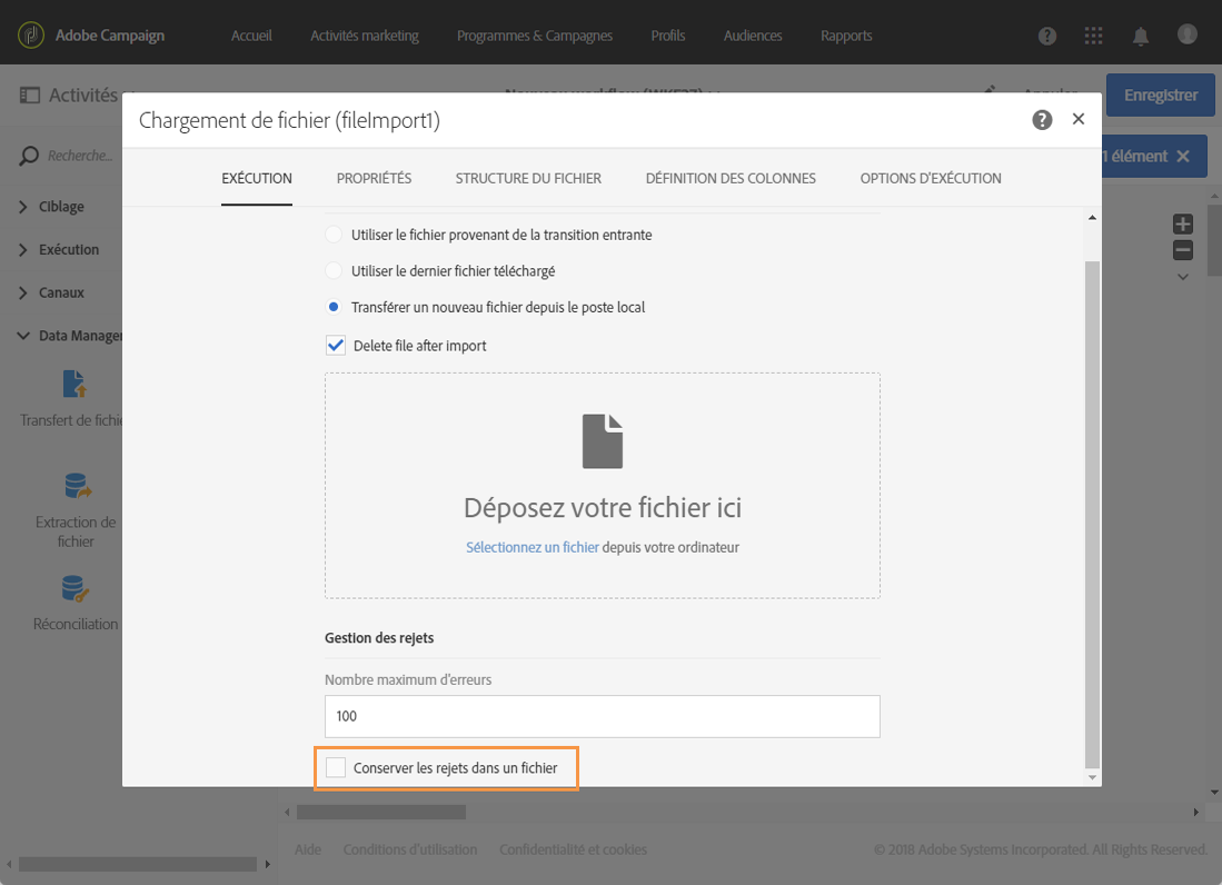 Si vous souhaitez que les utilisateurs puissent télécharger un fichier contenant les erreurs qui se sont produites pendant un import, cochez l’option Conserver les rejets dans un fichier et indiquez le Nom du fichier.