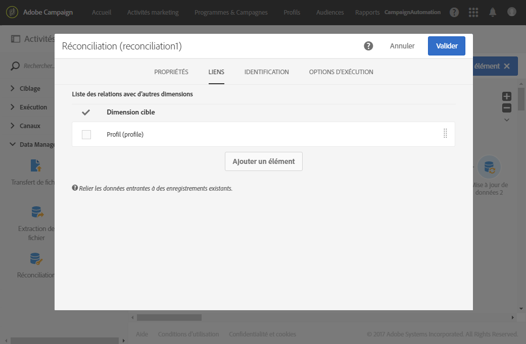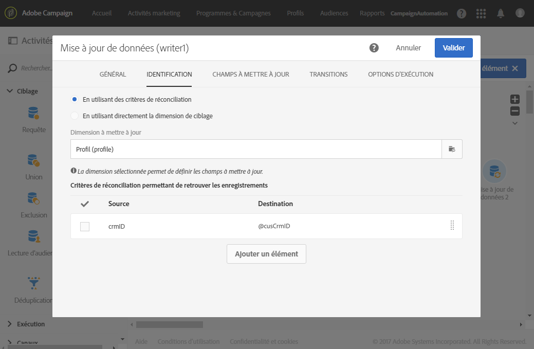 Dans l’onglet Identification, sélectionnez En utilisant des critères de réconciliation et définissez une clé entre la Dimension à mettre à jour, Profils dans le cas présent, et le lien créé dans l’activité Réconciliation. Dans cet exemple, le champ personnalisé Identifiant dans le CRM est utilisé.
