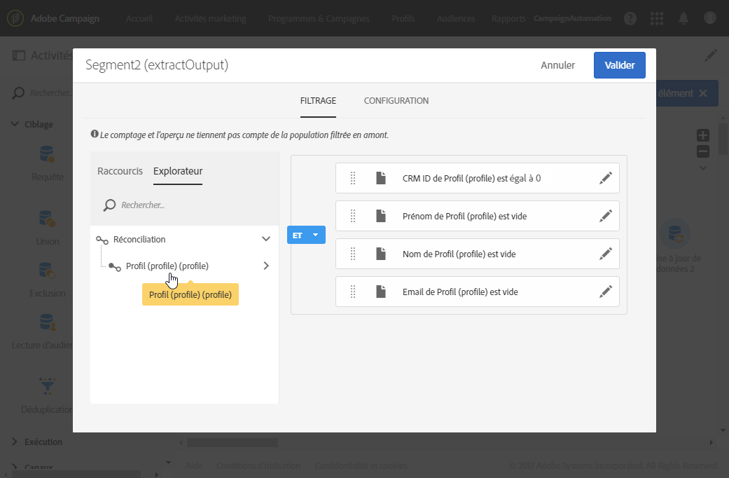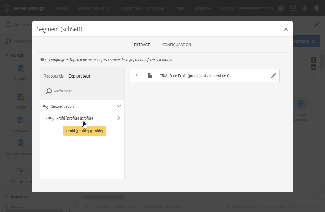 Dans le premier segment de l’onglet Segments, ajoutez une condition de filtrage sur la population entrante pour sélectionner uniquement les enregistrements pour lesquels l’identifiant dans le CRM du profil est différent de 0. De cette manière, les données du fichier réconciliées avec les profils de la base de données sont sélectionnées dans ce sous-ensemble.