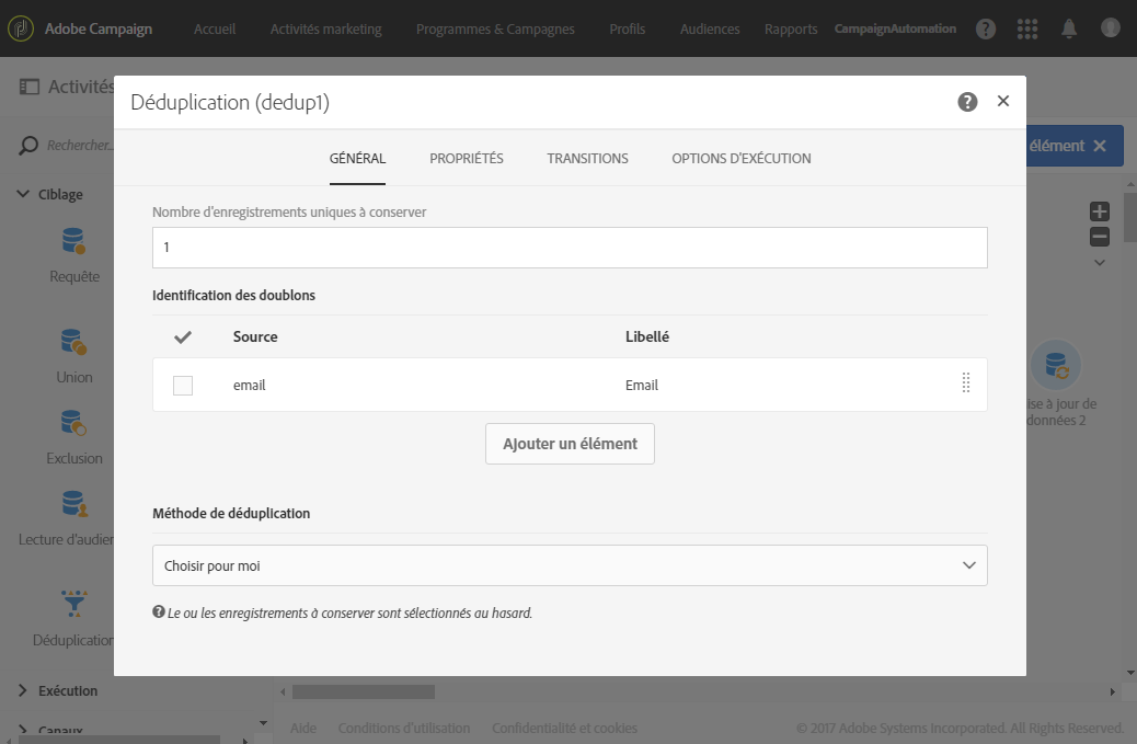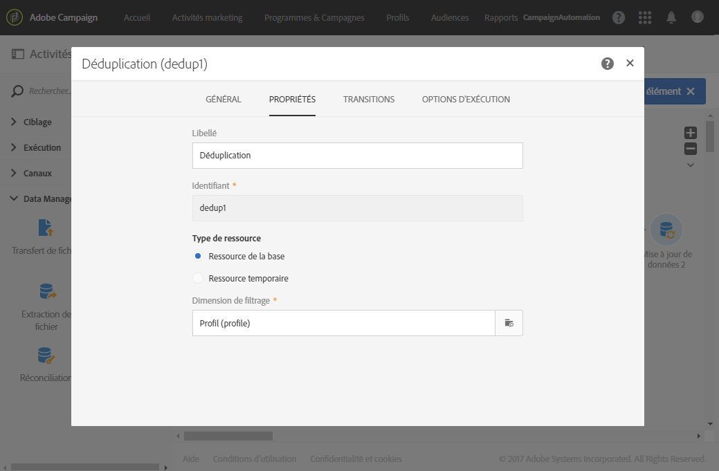 Configurez l’activité Déduplication située après la transition contenant les profils non réconciliés :