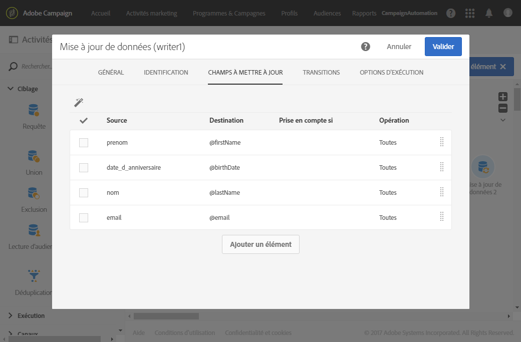 Configurez l’activité Mise à jour de données située après l’activité Déduplication paramétrée précédemment.