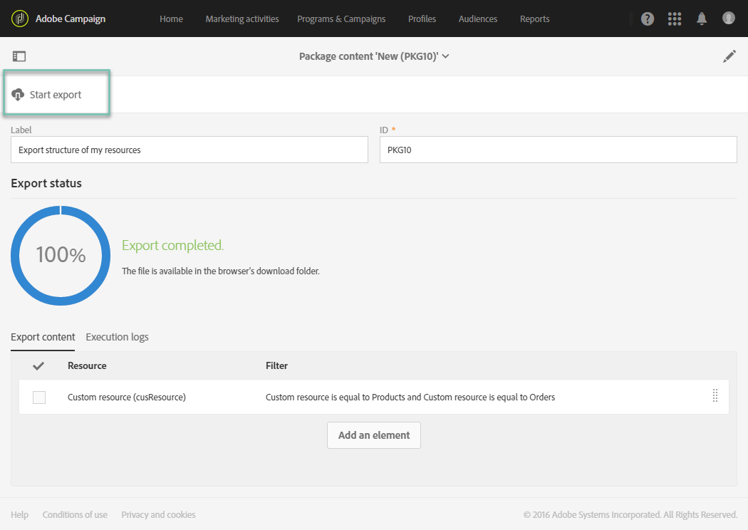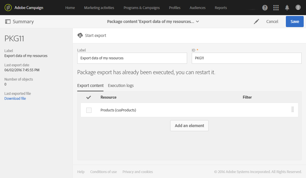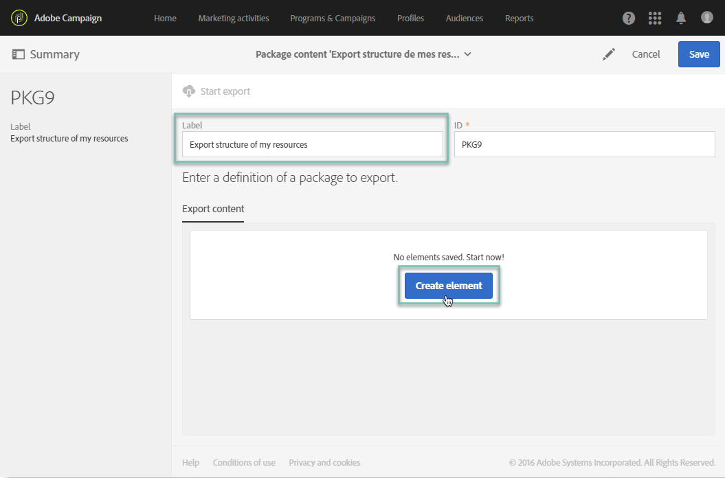 Export data of my resources을(를) 통해 레이블을 완성하고 Export content 탭의 Create element을(를) 클릭합니다.