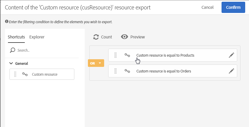Custom resource의 세부 사항을 구성하려면 필터링 조건에서 두 리소스 Products 및 Orders를 선택합니다.