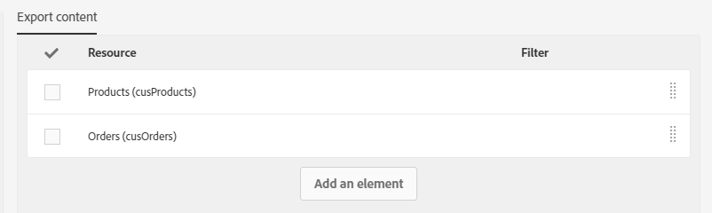 이 두 번째 내보내기를 통해 Products 및 Orders 사용자 지정 리소스에서 데이터를 내보낼 수 있습니다.