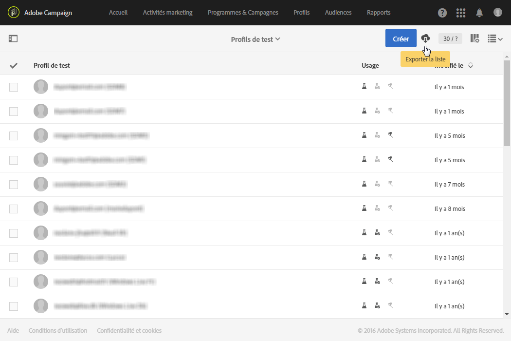 Accédez à l'écran de type Liste de votre choix. Par exemple, la vue d'ensemble des profils de test (Profils & audiences > Profils de test ).