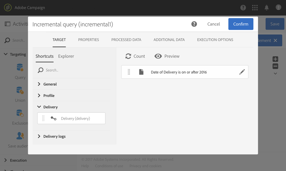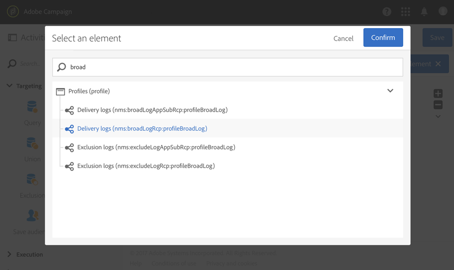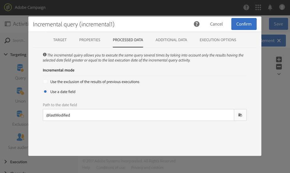 추가 Incremental query 활동을 구성하고 필요한 로그를 선택하도록 구성합니다. 예를 들어, 새 로그 또는 업데이트된 브로드로그(프로필 게재 로그)를 모두 선택하려면 다음을 수행합니다.