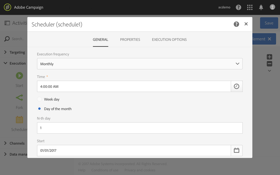 추가 Scheduler 활동을 만들고 필요에 따라 설정합니다. 다음은 월별 실행의 예입니다.