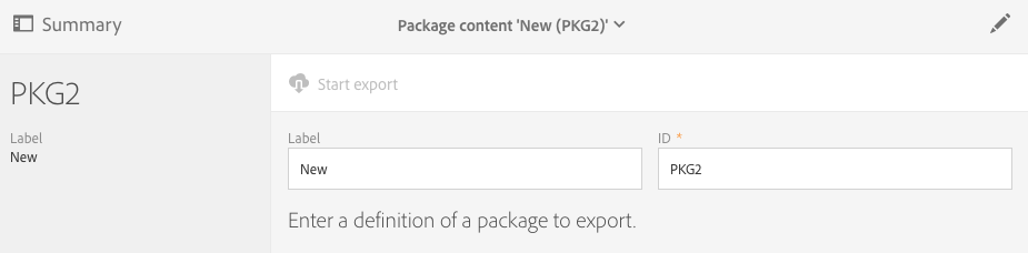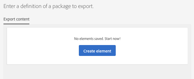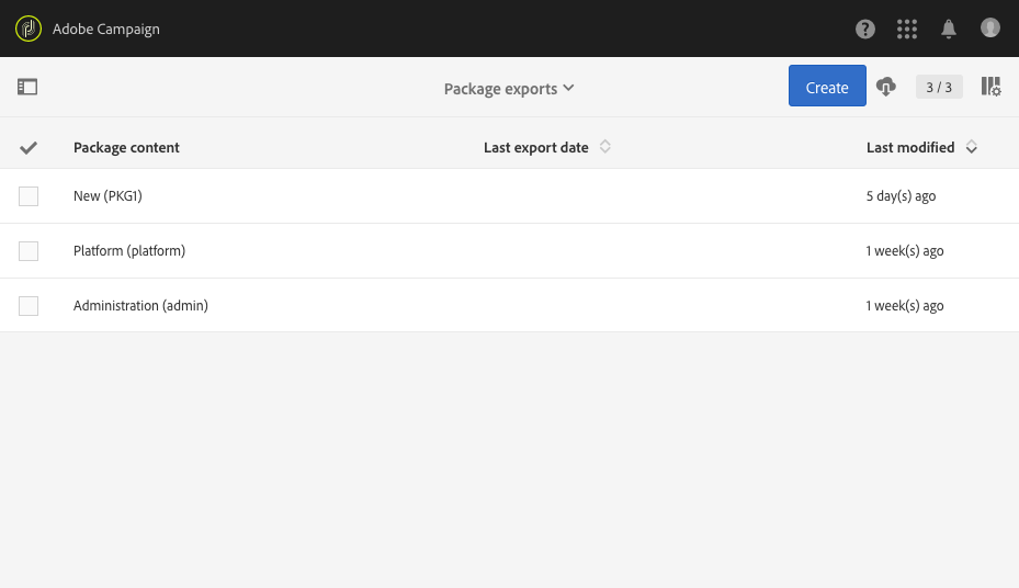 Administration > Deployment > Package exports에서 패키지 콘텐츠 목록에 있는 Create 버튼을 클릭합니다.