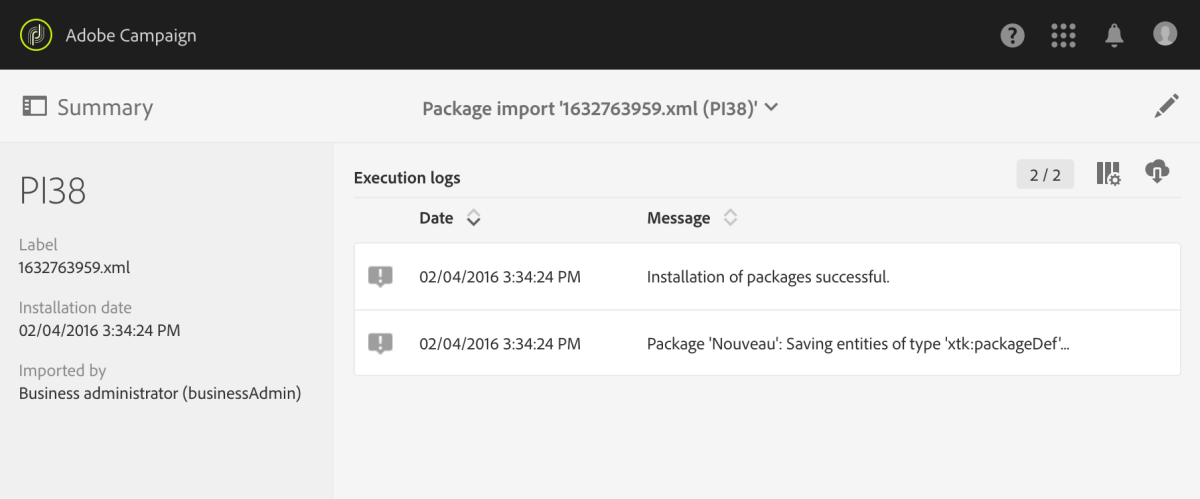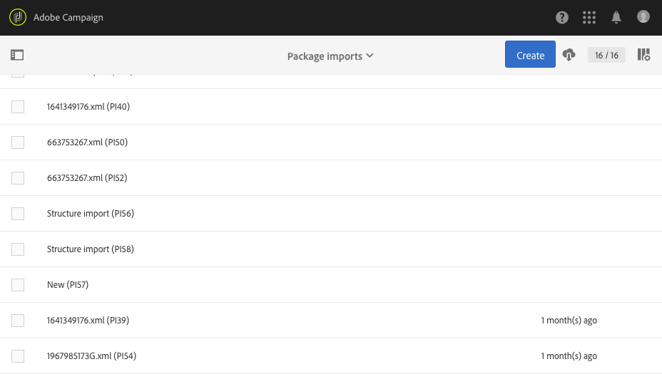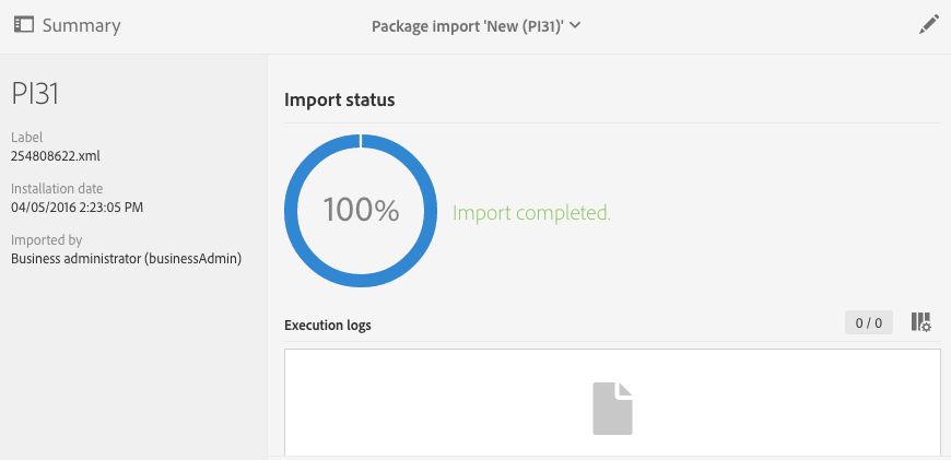 관리자는 Adobe Campaign 인스턴스에서 이전에 실행한 내보내기에서 생성된 패키지를 수동으로 가져올 수 있습니다. 자세한 내용은 패키지 내보내기 섹션을 참조하십시오.