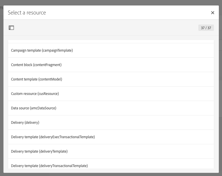 리소스는 알파벳순으로 표시되며 이름별로 필터링할 수 있습니다. 기술적 이름은 대괄호 안에 표시됩니다. 목록에서 요소를 선택하고 확인합니다.