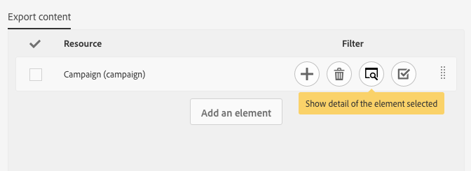 리소스 이름이 Export content 탭에 표시됩니다. 리소스를 수정하려면 해당 상자를 선택하고 Show detail of the element selected 버튼을 사용합니다.