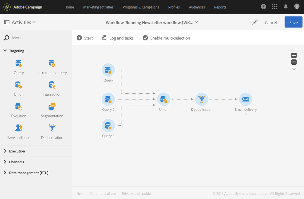 따라서 중복 제거에는 인바운드 전환이 하나만 있는 것이 좋습니다. 이를 위해 조합 활동, 교차 활동 등과 같은 타겟팅 요구에 해당하는 활동을 사용하여 서로 다른 쿼리를 결합할 수 있습니다. 예제:
