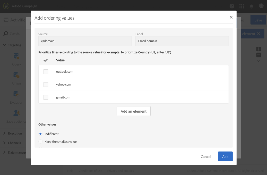 Following a list of values: 하나 이상의 필드에 대한 값 우선 순위를 정의할 수 있습니다. 값을 정의하려면 필드를 선택하거나 표현식을 만든 다음 해당 테이블에 값을 추가합니다. 새 필드를 정의하려면 값 목록 위에 있는 Add 버튼을 클릭합니다.