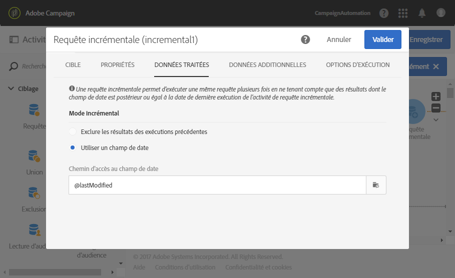 L'activité Requête incrémentale permet de filtrer et d'extraire une population d'éléments de la base de données Adobe Campaign. A chaque nouvelle exécution de cette activité, les résultats des exécutions précédentes sont exclus. Cela permet de ne cibler que les éléments nouveaux.