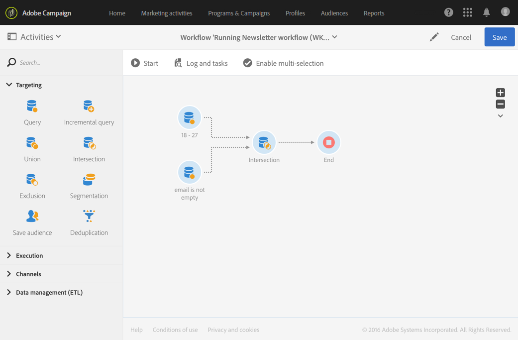 다음 예는 두 쿼리 활동 간의 교차를 보여줍니다. Adobe Campaign 데이터베이스를 검토하고 18~27세 사이의 프로필과 전자 메일 주소가 각각 제공된 프로필을 검색하는 데 사용됩니다.