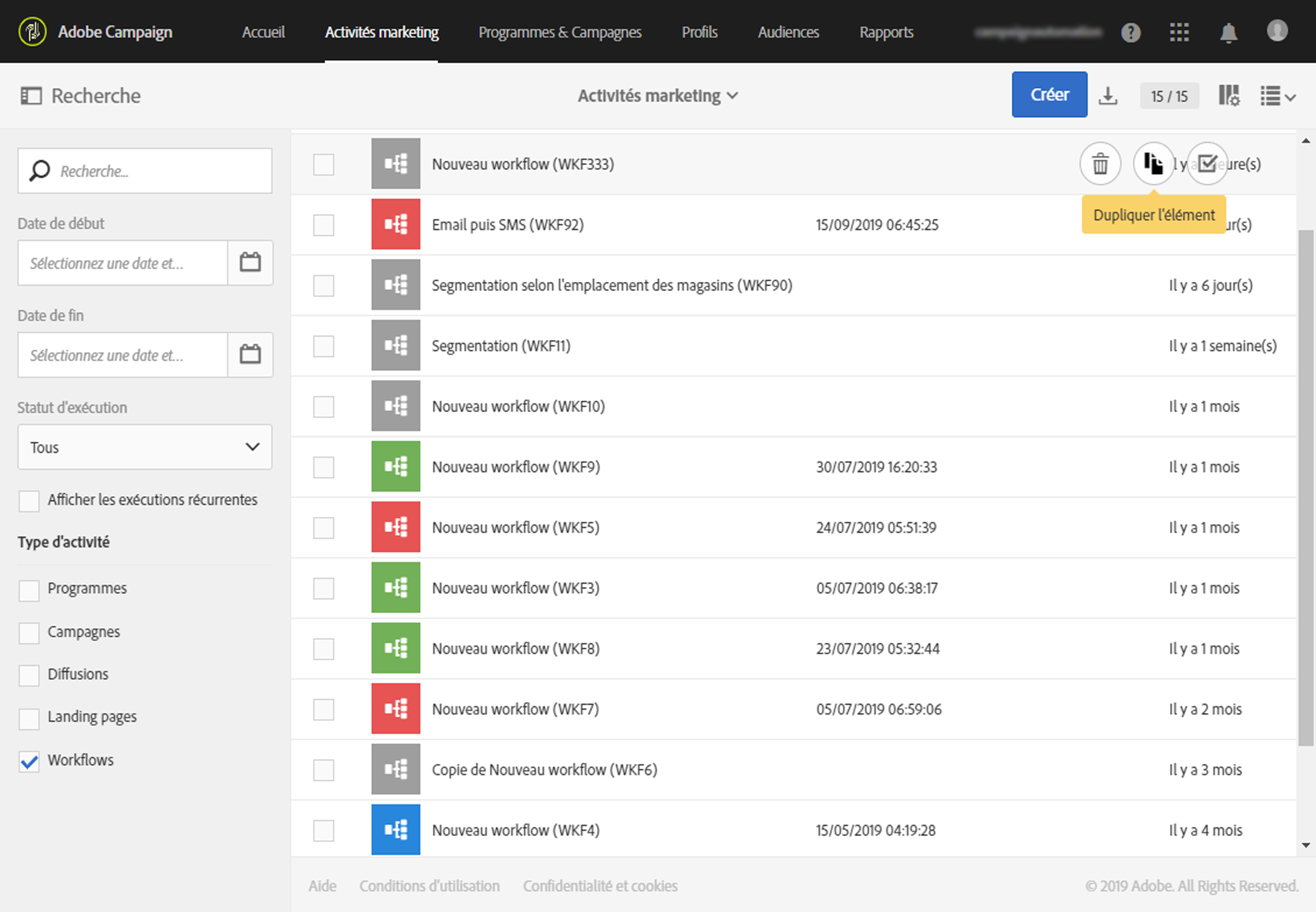 Vous pouvez dupliquer des workflows. Dans Activités marketing, pointez sur le workflow et cliquez sur Dupliquer l'élément. Une fois le workflow dupliqué, ses modifications ne sont pas appliquées à la copie de celui-ci. La copie du workflow peut être éditée.
