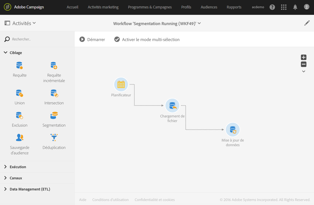 De plus, les activités Ciblage et Gestion des données (ETL) permettent de définir des codes segment pour leurs transitions sortantes. Vous pouvez ensuite créer des rapports à partir de ces codes segment pour mesurer l’efficacité des campagnes marketing. Voir à ce propos cette section.