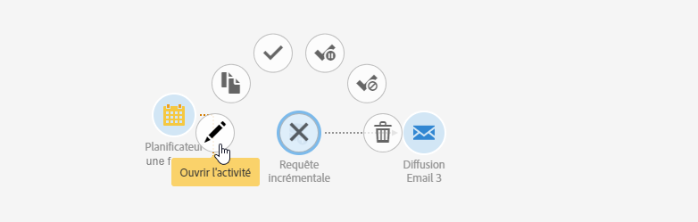 Lorsqu’une activité est sélectionnée, des actions rapides s’affichent autour de celle-ci et permettent d’interagir avec. Par exemple pour paramétrer une activité, sélectionnez-la puis ouvrez-la à l’aide du bouton